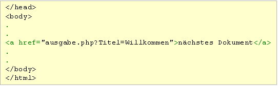 Datenübergabe per URLBeispiel: Der Begriff "Willkommen" soll an ein anderes Dokument übergeben und dort ausgegeben werden. Daten mit Fragenzeichen(?) an das URL anhängen. |